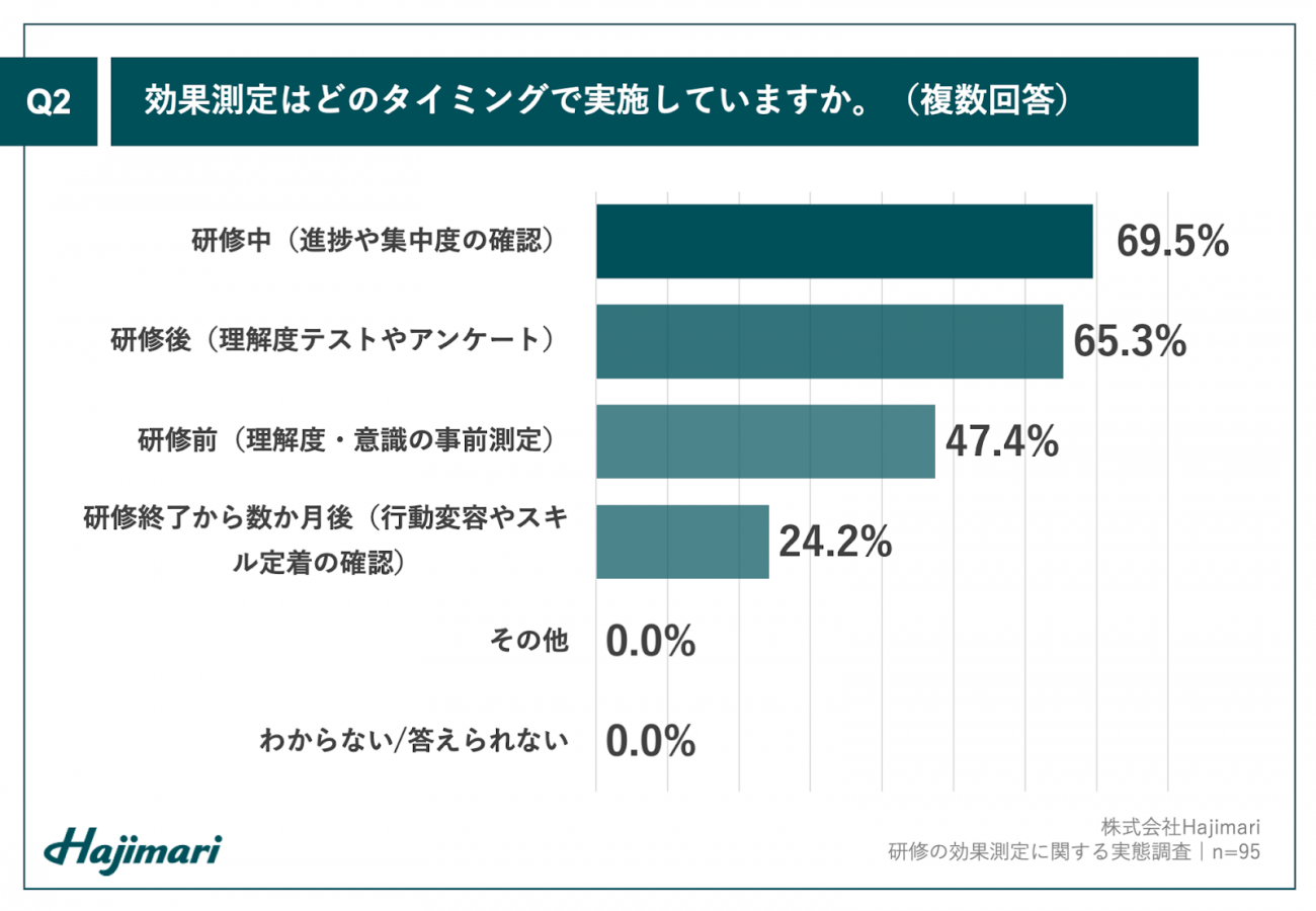「Q2. Q1で「十分にできている」「ややできている」と回答した方にお聞きします。効果測定はどのタイミングで実施していますか。(複数回答)」と質問したところ、「研修中(進捗や集中度の確認)」が69.5%、「研修後(理解度テストやアンケート)」が65.3%、「研修前(理解度・意識の事前測定)」が47.4%という回答となった。