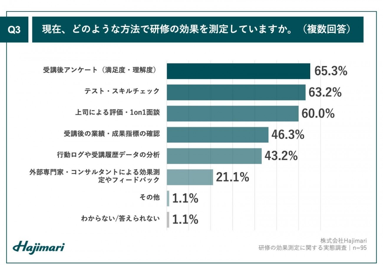 Hajimariは、直近2年以内に社内研修を実施した従業員数500名以上の企業の人事担当者110名を対象に、研修の効果測定に関する実態調査を実施した。