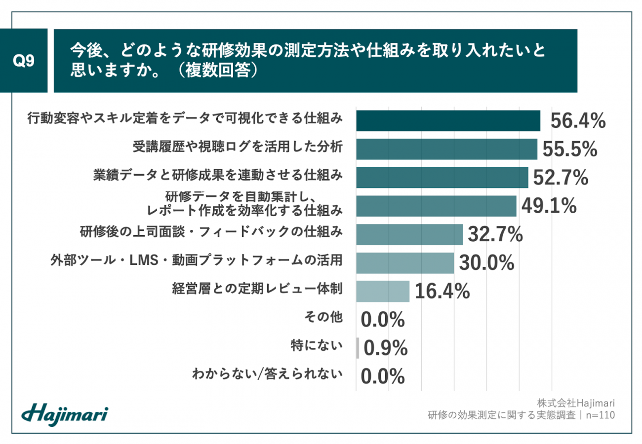 「Q9. 今後、どのような研修効果の測定方法や仕組みを取り入れたいと思いますか。(複数回答)」と質問したところ、「行動変容やスキル定着をデータで可視化できる仕組み」が56.4%、「受講履歴や視聴ログを活用した分析」が55.5%、「業績データと研修成果を連動させる仕組み」が52.7%という回答となった。