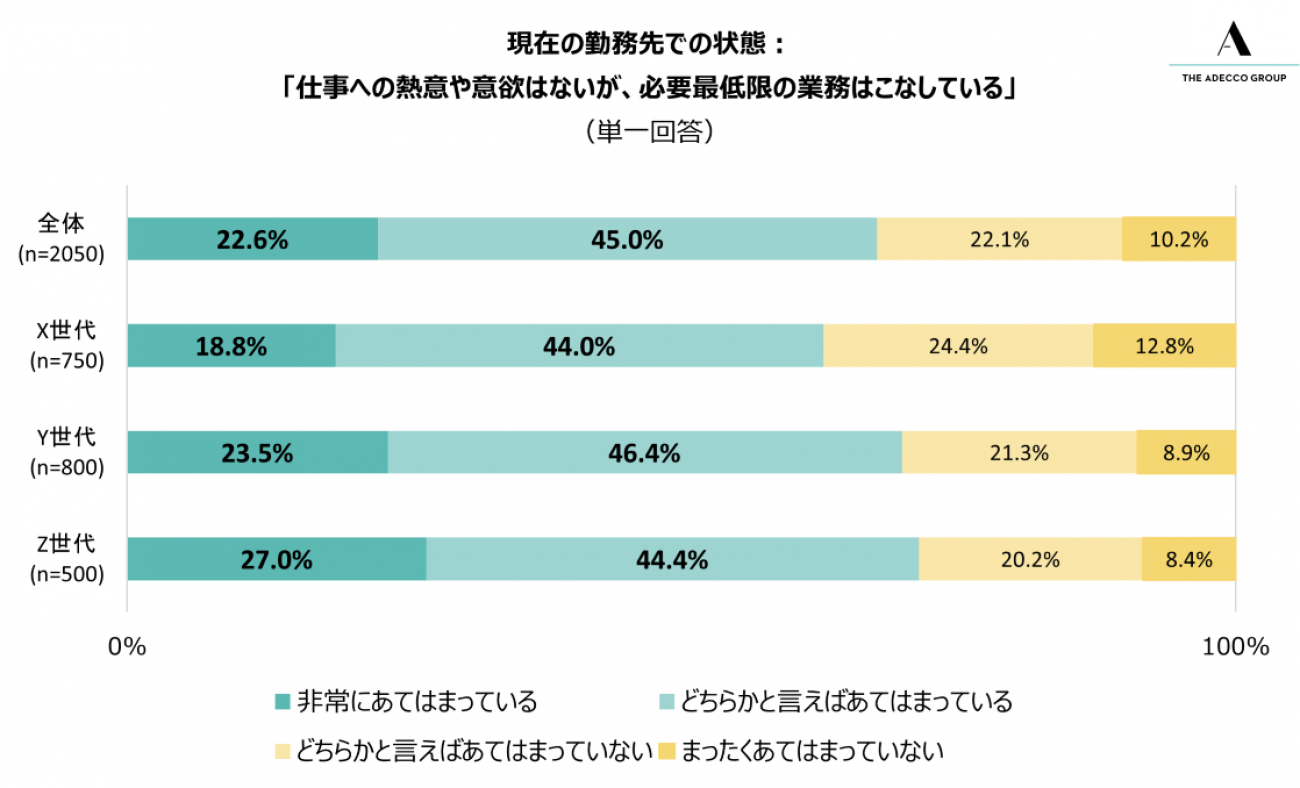 - X・Y・Z世代の就業者の約7割が、「仕事への熱意や意欲はないが、必要最低限の業務はこなしている」と回答し、「静かな退職」の状態にあった