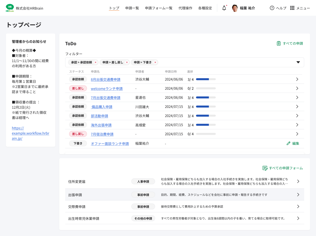 HRBrain ワークフローでは、申請や承認業務のToDoを1つの画面に集約。申請フォームは用途ごとに分類整理できる。これにより、従業員が必要な書類を迷わず選択できるようになり、対応漏れや作業の煩雑化を防止する。また、承認が必要な申請や差し戻しされた申請の状況をToDoリストとして明確に表示し、進捗管理の負荷を軽減する。