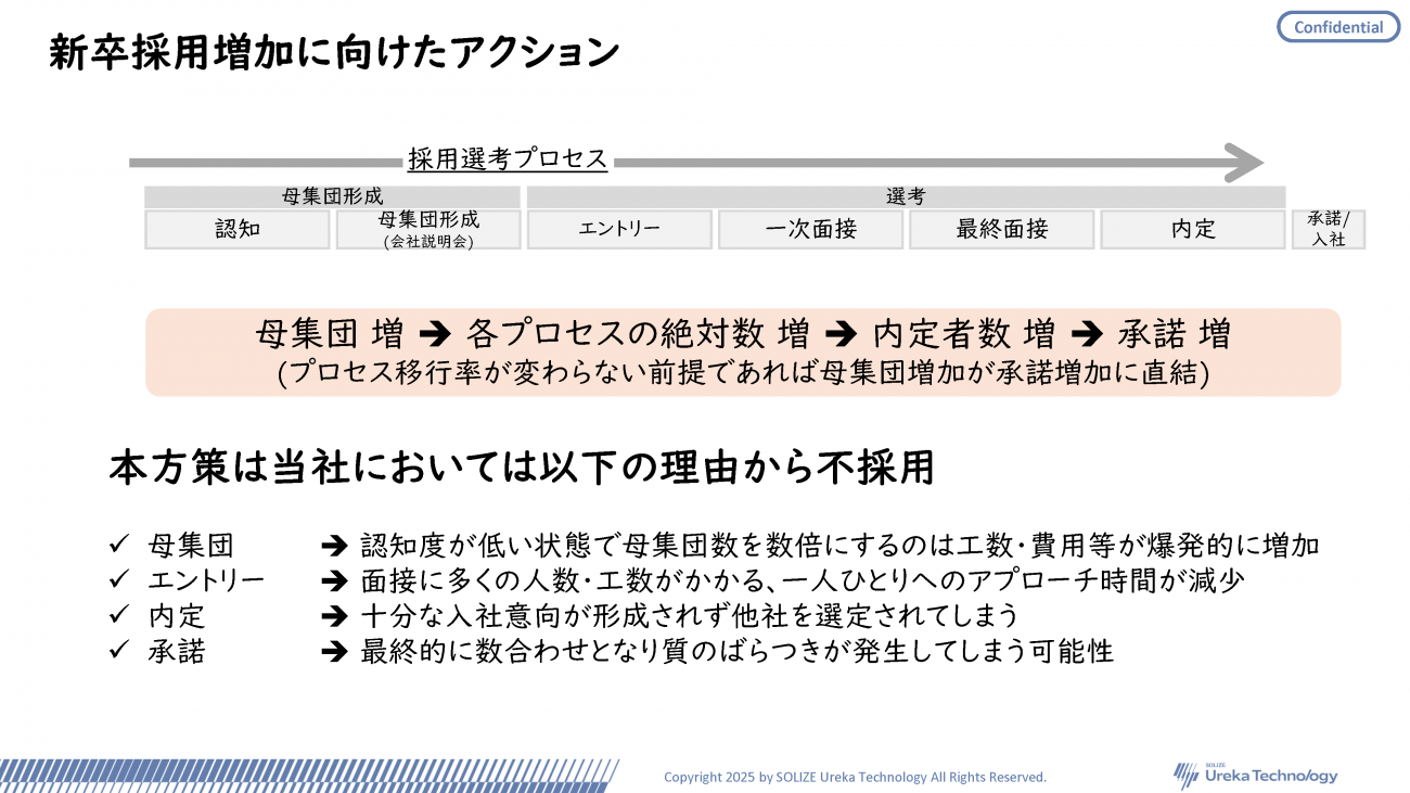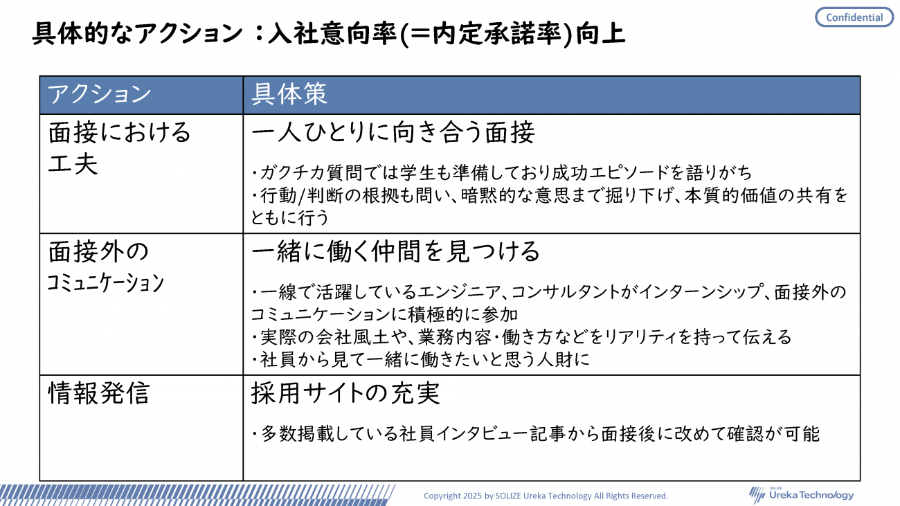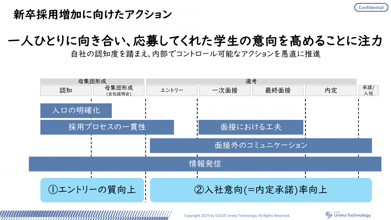 特筆すべきは、そのアクション内容だ。堤氏は「超売り手市場の中で、認知度が高くない我々が闇雲に母集団を増やそうとするのは非効率だと考えた」と述べ、“母集団やエントリー数を増やして選考で絞り込む”プロセスは行わないことに。代わりに、自分たちを探し当ててくれた学生とのコミュニケーション密度を高め、内定承諾率を向上させることに注力した。
