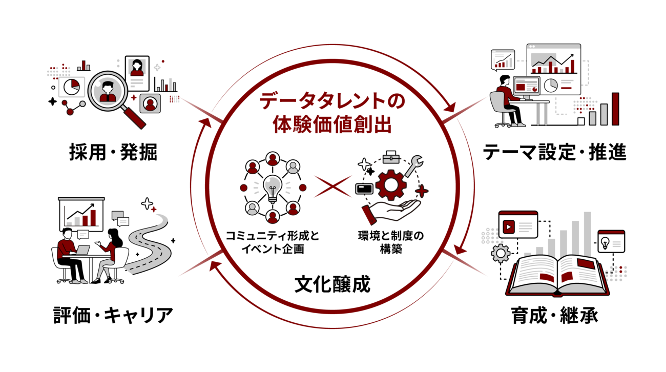 具体的には、データサイエンティストやAI活用人材の「採用」支援から、データやAIで具体的に何をするのかという「テーマ」を明確化したうえで進める「OJT・育成」、専門人材に適した「評価・キャリア形成」、自律的にデータ・AI活用が進む「文化醸成」まで、企業のフェーズに合わせた支援を行う。