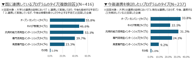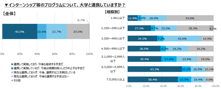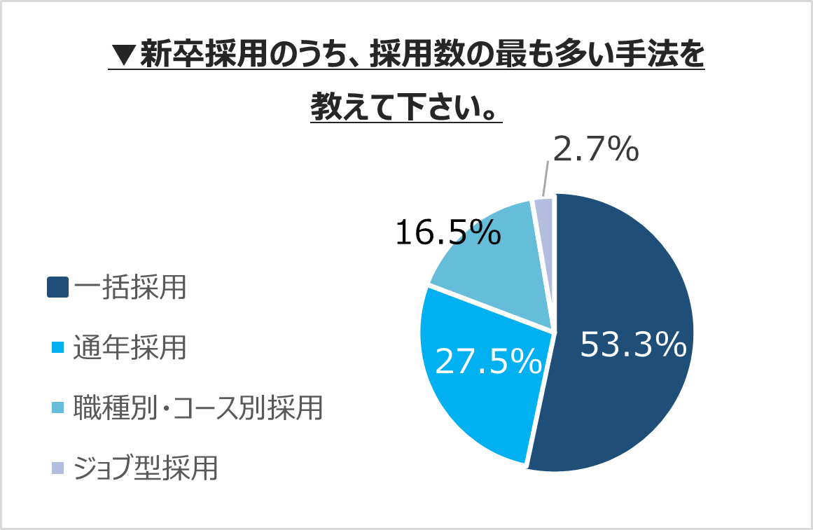 採用手法については、従来主流である「一括採用」が依然として53.3%と最多となったが、「通年採用」(27.5%)や「職種別・コース別採用」(16.5%)も一定の割合を占めており、手法の多様化がみられた。また大学とは、半数を超える企業(50.6%)が何らかの連携を進めている。大学と連携したプログラムでは「オープンカンパニー」と「汎用的能力活用型インターンシップ」が中心となっている。