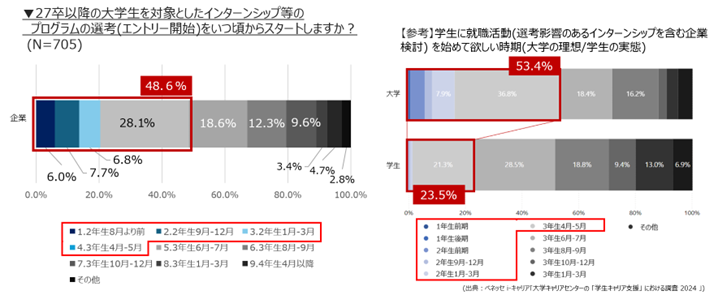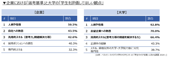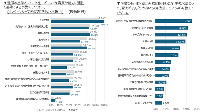 選考開始時期については、企業のインターンシップなどのプログラムの選考開始時期が大学3年生の4~5月に集中しており(48.6%)、大学側の認識(53.4%)とほぼ一致している。大学の「学生を評価して欲しい項目」も一致しており、「人柄や性格」「自社への熱意」「汎用的スキル」が共通して上位となった。