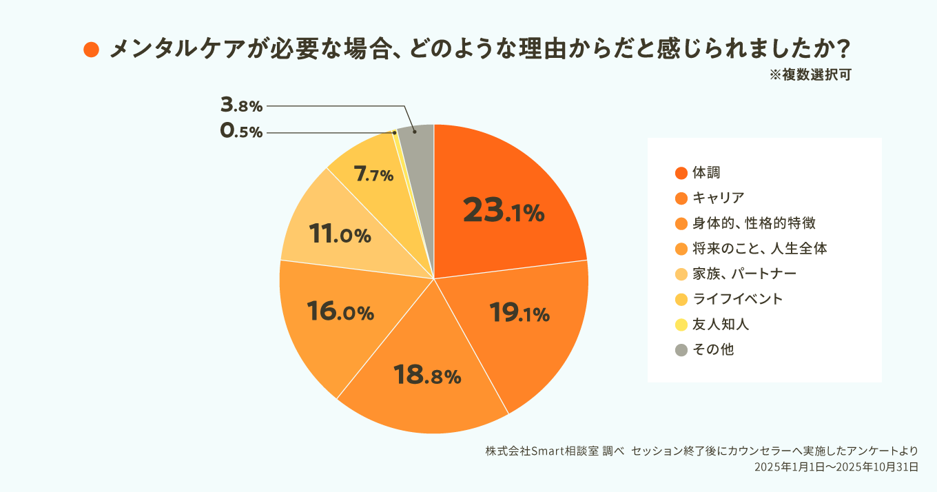 一方で、カウンセラーが「メンタルケアが必要」と判断した相談者は約22%だった。その理由としては、「体調」が23.1%と最も多く、メンタル不調が身体症状に現れるほど深刻な状態の人からの相談が一定数あることが分かる。また、「身体的・性格的特徴」を背景にメンタルケアが必要と判断されたケースも18.8%と比較的多く見られた。さらに、「キャリア」(19.1%)や「将来のこと、人生全体」(16.0%)といった未来に関する不安がメンタル不調の要因になっていると考えられる人も約3.5割にのぼった。