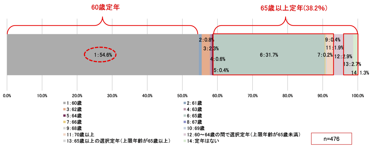 - 一方、「65歳以上定年(選択定年および定年なしも含む)」が38.2%
