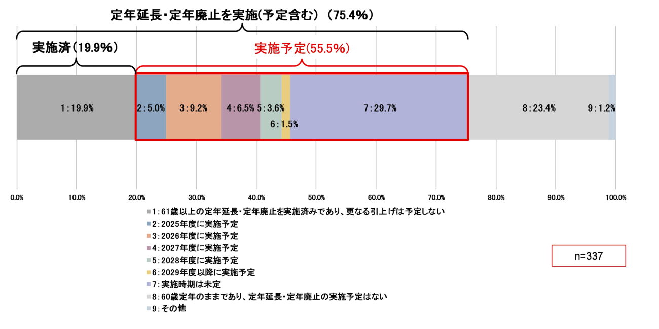 - 定年延長予定は、「実施済」19.9%と「実施予定(時期未定含む)」55.5%の合計で75.4%を占め、今後も定年延長・定年廃止の企業の増加が見込まれる