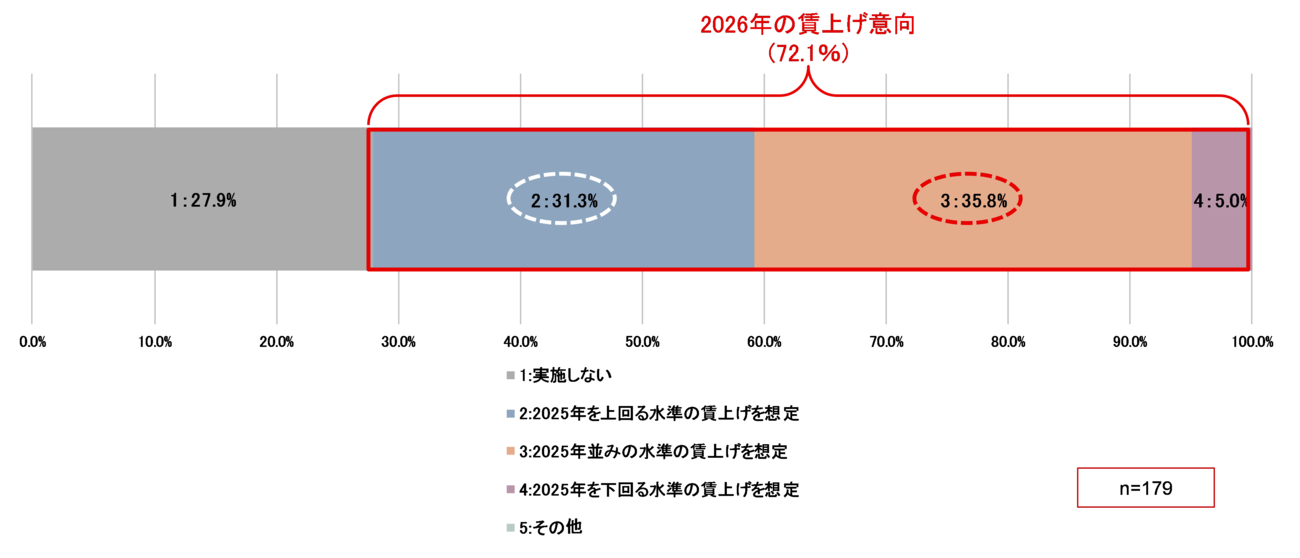 - さらに、「2025年を下回る水準」を含めると、2026年の賃上げ意向は7割を超える