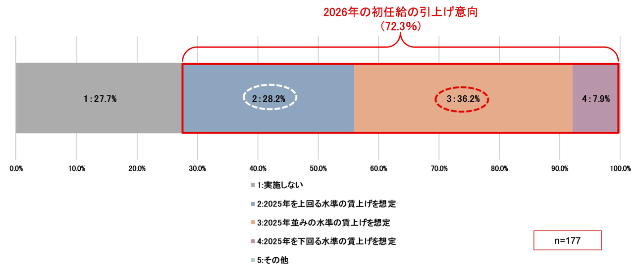- さらに、「2025年を下回る水準」を含めると、賃上げ同様初任給の引き上げ意向も7割を超える