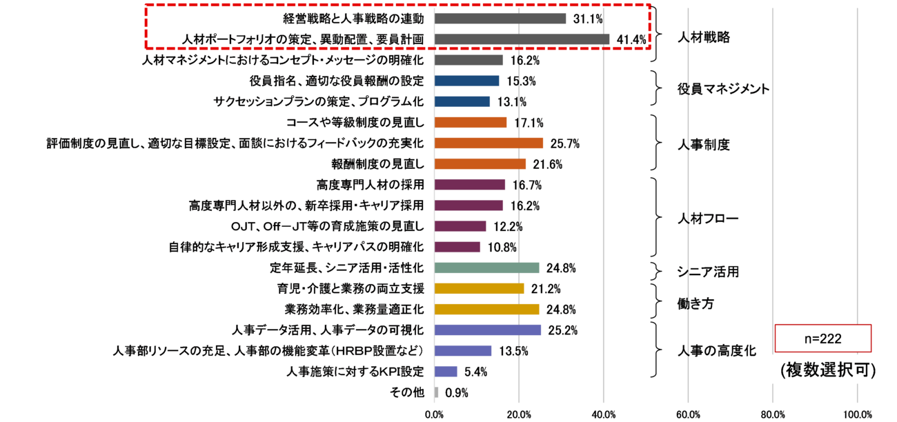 - 次いで、「経営戦略と人事戦略の連動」が31.1%で、いずれも人材戦略の項目