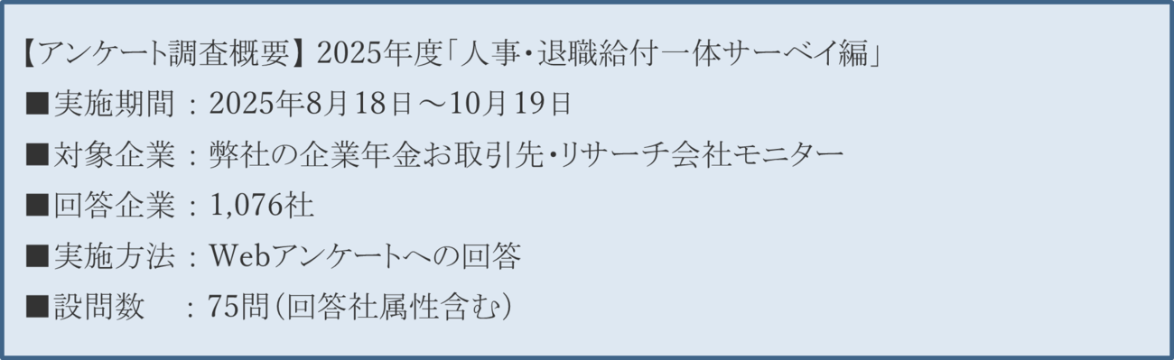 2025年は退職給付制度、人事制度、人的資本情報開示、福利厚生関連制度、株式報酬制度などを中心にアンケート調査を実施。以下はその結果のサマリーである。
