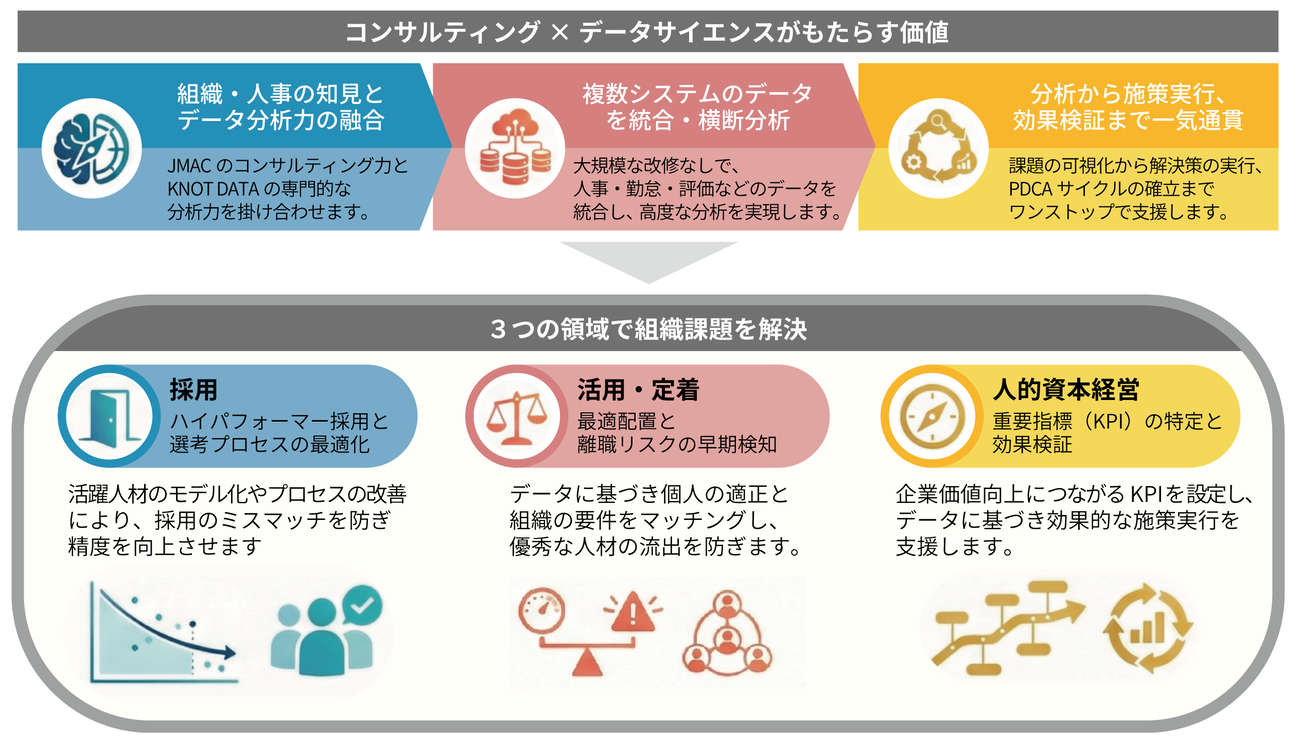 同サービスは、採用・育成・評価・定着(離職防止)など多岐にわたる人事データを統合し、AIツールや高度な統計手法を用いた分析・予測から、コンサルティングを通じた施策実行・効果検証までを一気通貫で提供。すでに採用プロセスの効率化や従業員エンゲージメント向上の実績もあるといい、JMACによるコンサルティングとKNOT DATAによるデータサイエンスの相乗効果で、企業の組織課題解決を推進する。