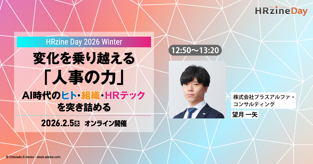 2026年2月5日(木)に開催されるオンラインイベント「HRzine Day 2026 Winter」。本イベントに、プラスアルファ・コンサルティングのタレントパレット事業本部 セールスコンサルティング部 執行役員 望月一矢氏が登壇する。