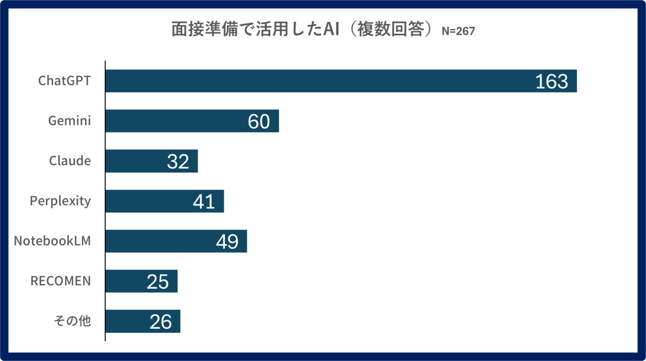 面接準備ではChatGPTの利用が最も多く、次点のGeminiとの差は100名以上と大きく開いていた。また、NotebookLMの利用も一定数見られ、学生が応募企業ごとに自身と企業の情報をAIに学習させ、企業別に最適化された模範回答を生成している様子がうかがえる。