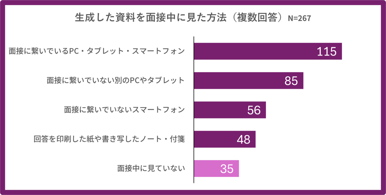 面接準備で生成AIを利用した267名のうち、232名(86%)が事前に生成した資料を、実際の面接中に参照していた。特に、面接で使用している端末で閲覧したケースが最も多く、Web面接において生成AIを自然に参照する行為が広く浸透している実態が明確になった。