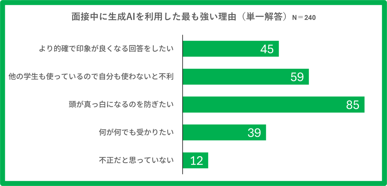 AIで生成した資料を面接中に閲覧したり、リアルタイム入力によって回答支援を受けた57%の学生(重複除外240名)に面接中に生成AIを利用した最も強い理由を尋ねたところ、「頭が真っ白になることを防ぐため」(35%)が最多。次いで「他の学生も使っているので、自分も使わないと不利になるため」(24%)が続いた。