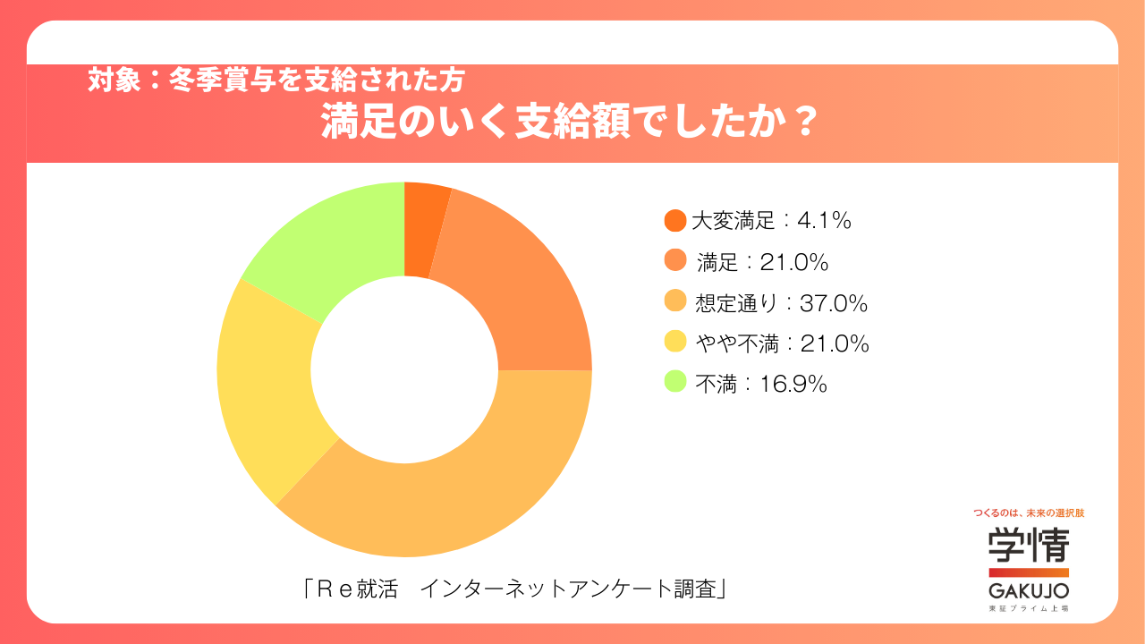 冬季賞与は、75.5%が支給されていた。支給額については、「想定通り」が最多の37.0%。満足している人は、25.1%。一方で、37.9%が現状の結果に不満を感じているという結果だった。