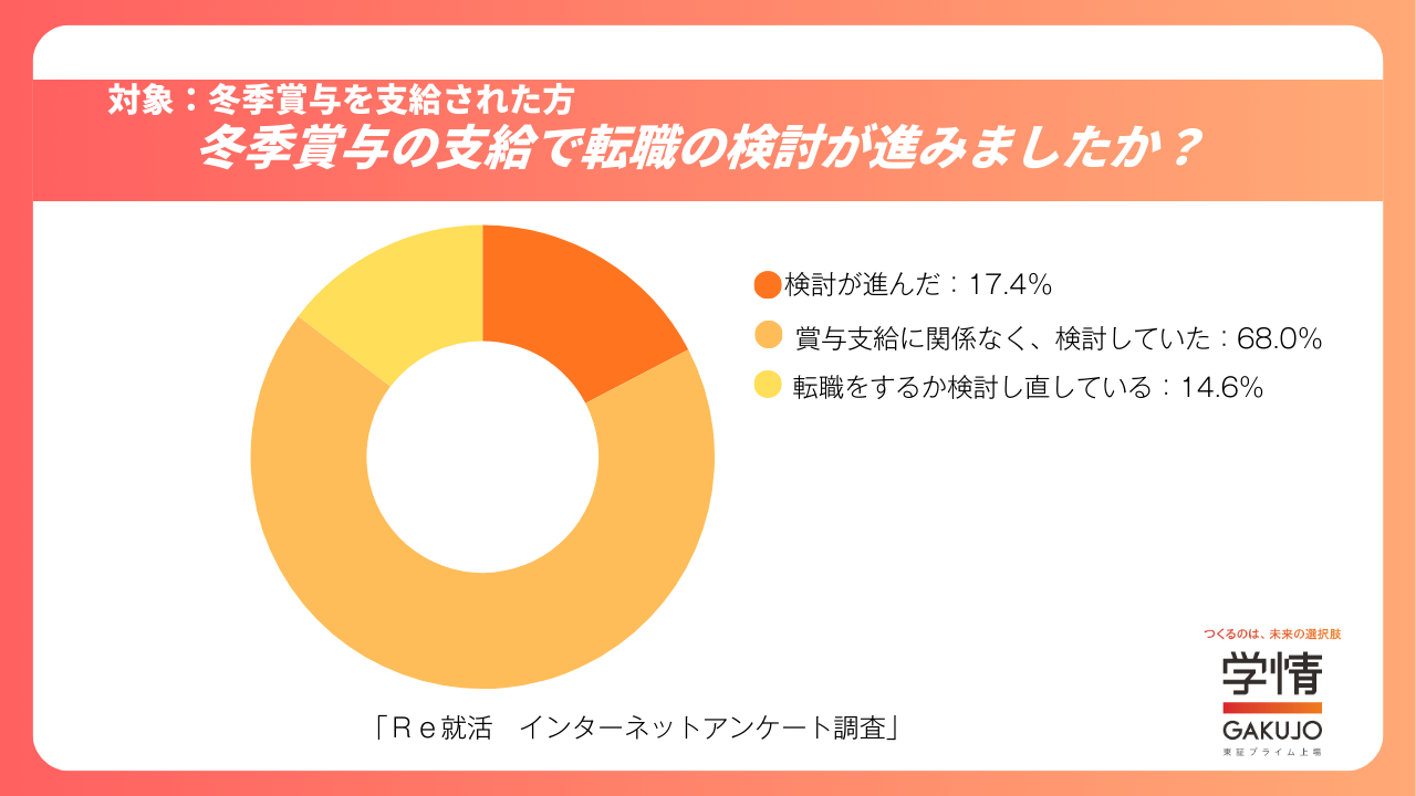 冬季賞与の支給によって、転職の検討が進んだか、という質問には、68.0%が「賞与支給に関係なく、検討していた」という回答。ただ、17.4%は検討が進んだと回答し、賞与の支給額が、転職意向に関わっているケースがあることが分かった。