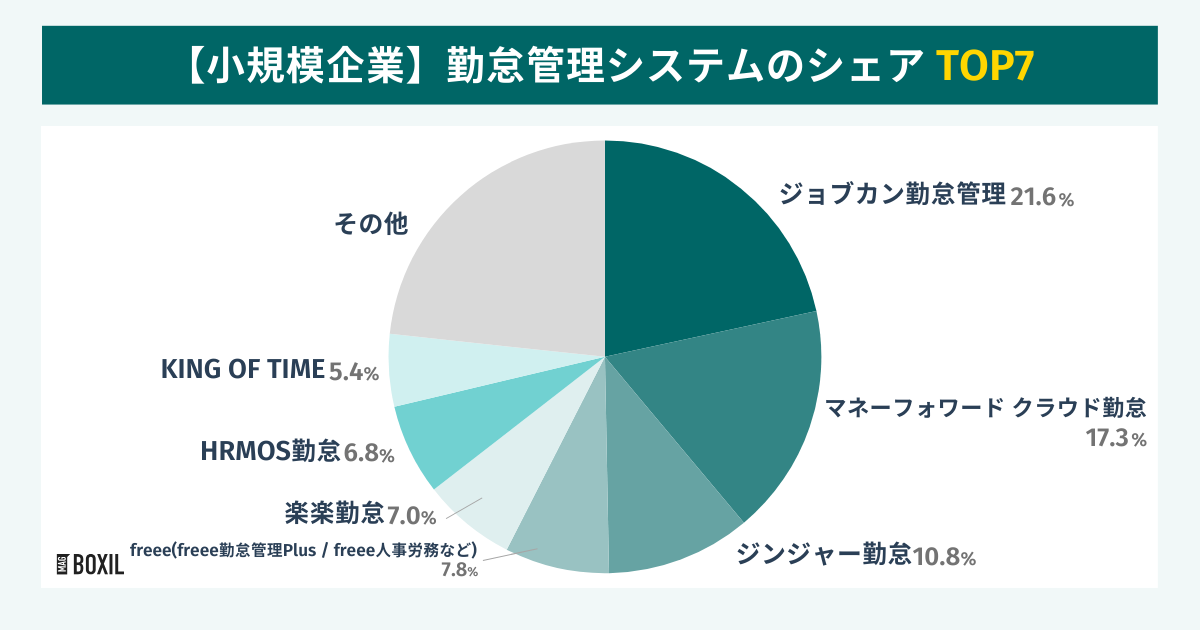 アカウント数が49件以下の小規模企業において、シェアが最も高い勤怠管理システムは「ジョブカン勤怠管理」(21.6%)であった。次いで「マネーフォワード クラウド勤怠」(17.3%)、「ジンジャー勤怠」(10.8%)、「freee(freee勤怠管理Plus / freee人事労務など)」(7.8%)と続く。