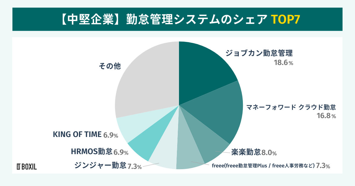 アカウント数が300〜999件の中堅企業でシェアが最も高い勤怠管理システムは、「ジョブカン勤怠管理」(18.6%)であった。2位「マネーフォワード クラウド勤怠」(16.8%)、3位「楽楽勤怠」(8.0%)と続き、さらに、4位以下のサービスもシェアが近く、各社がほぼ横並びの状況となった。