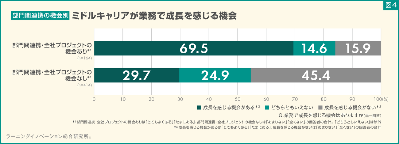 部門間連携の機会があるミドルキャリアのほうが、成長を感じる機会がある傾向が見られた。