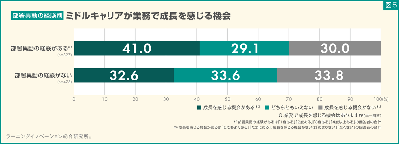結果、部署異動の経験があるミドルキャリアのうち、「成長を感じる機会がある」と回答した割合は41.0%で、部署異動の経験がないミドルキャリアの32.6%より8.4ポイント高い結果となった。