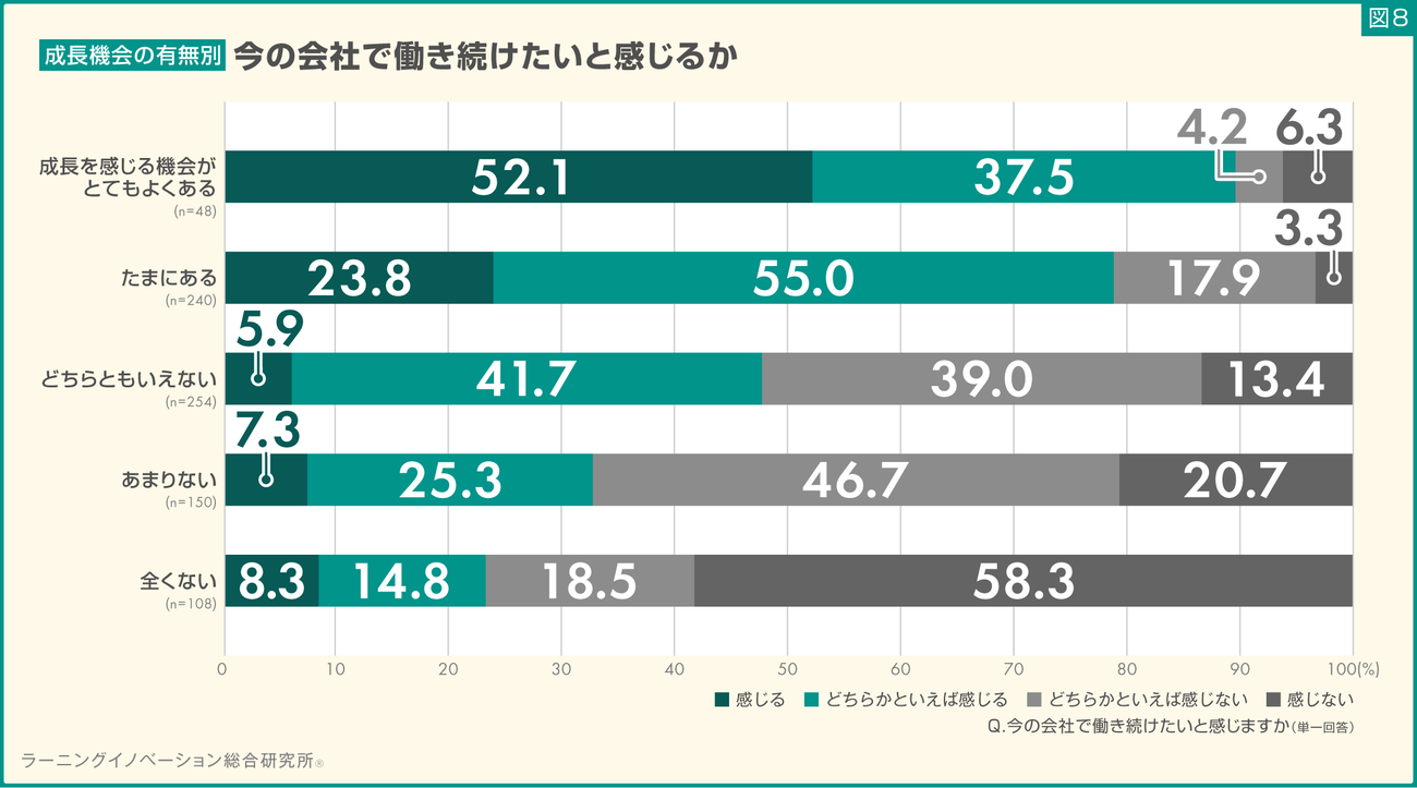 最後に、成長を感じる機会の有無と、今の会社での勤続意向の関係を見ていく。