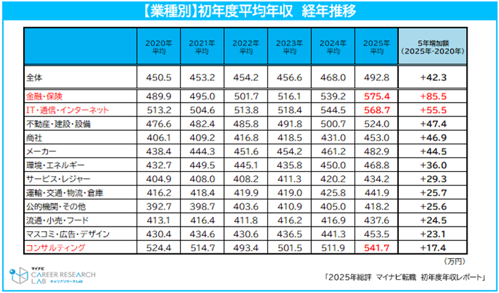 初年度平均年収を業種別にみると、2025年平均は「金融・保険」が575.4万円で最も高く、「IT・通信・インターネット」が568.7万円、「コンサルティング」が541.7万円で続いた。
