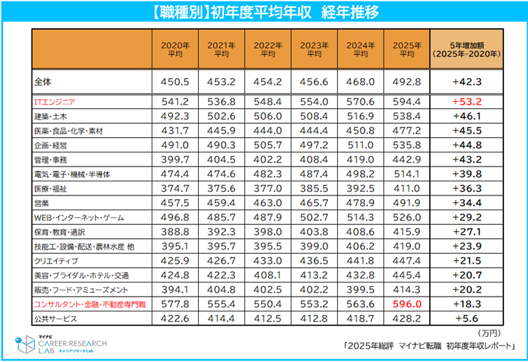 2025年の初年度平均年収は、集計開始して以降最高の492.8万円。5年前の2020年平均と比べて40万円以上増加