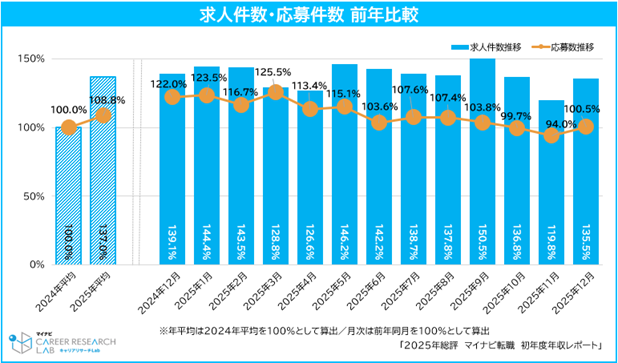 求人件数の2025年平均は前年比137.0%、応募件数の2025年平均は前年比108.8%だった。いずれも増加しているが、求人件数に比べて応募件数は緩やかな伸びとなった。