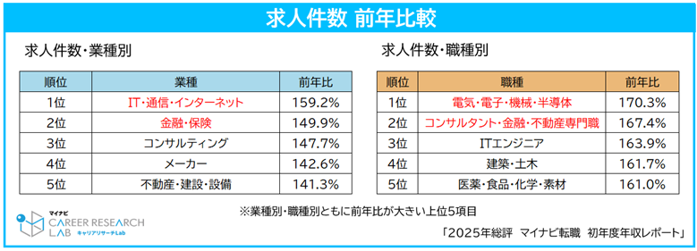 マイナビは、同社が運営する総合転職情報サイト「マイナビ転職」において、「正社員の平均初年度年収推移レポート」と「正社員求人件数・応募数推移レポート」の2025年の総評を発表した。同調査は、マイナビ転職に掲載された求人の「初年度平均年収」「求人件数・応募数」の推移を調査したもの。