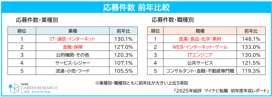 応募件数を業種別にみると、「IT・通信・インターネット」が前年比130.1%、「金融・保険」が前年比127.0%で特に増加幅が大きい。