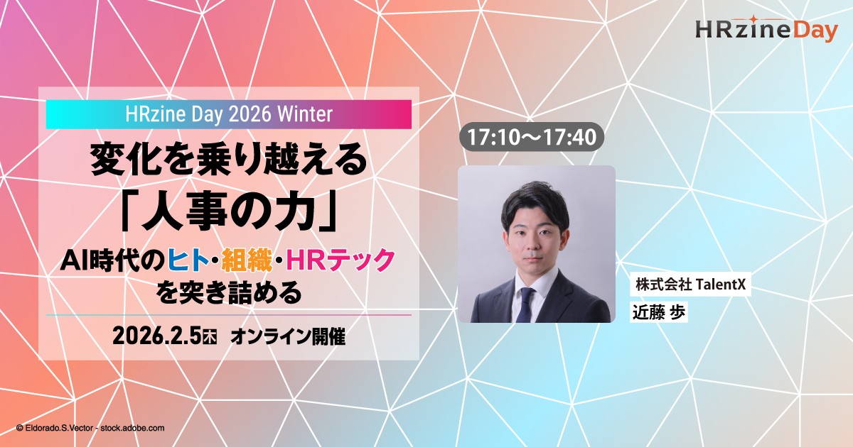 2026年2月5日(木)に開催されるオンラインイベント「HRzine Day 2026 Winter」。本イベントのA-8講演(17:10~17:40)に、株式会社TalentX Myシリーズイノベーション部 執行役員 近藤歩氏が登壇する。