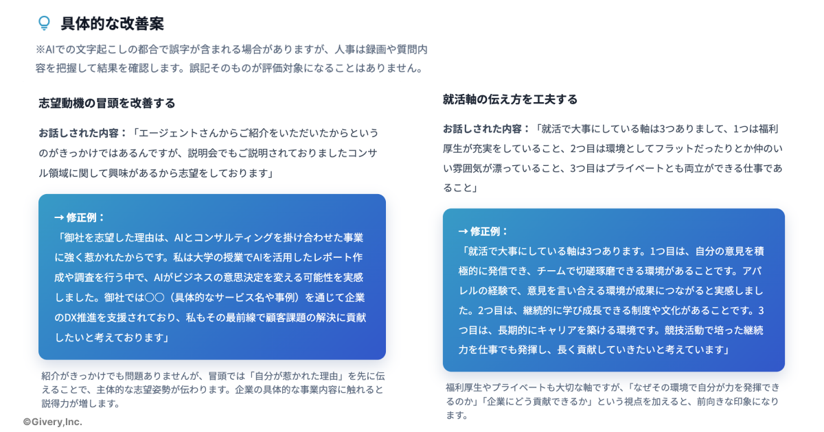 • 具体的な改善案:会話ログから原文を引用し、次回の面接でそのまま使える自然な日本語の「修正例」を提示。