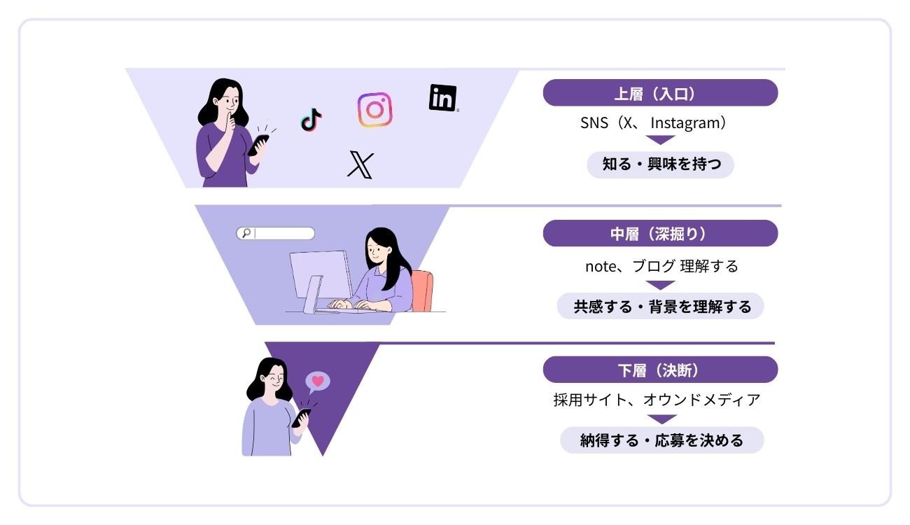 同じ内容でも、「SNSは入口」「ブログは理解」「オウンドメディアは決断」という役割分担で設計する。これが、採用広報を立体的に機能させるコツです。