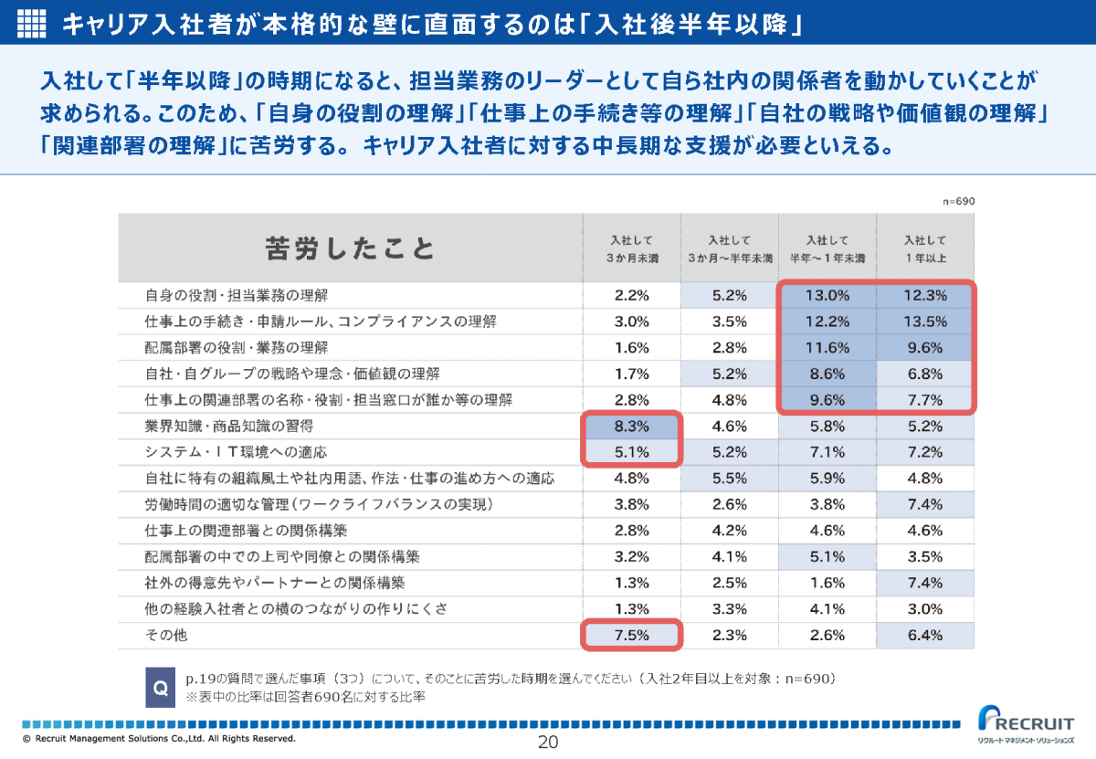キャリア入社者が入社後に苦労した項目と時期を見ると、担当業務の理解や関連部署との関係構築など、本格的な壁に直面するのは入社後半年以降が多いという。
