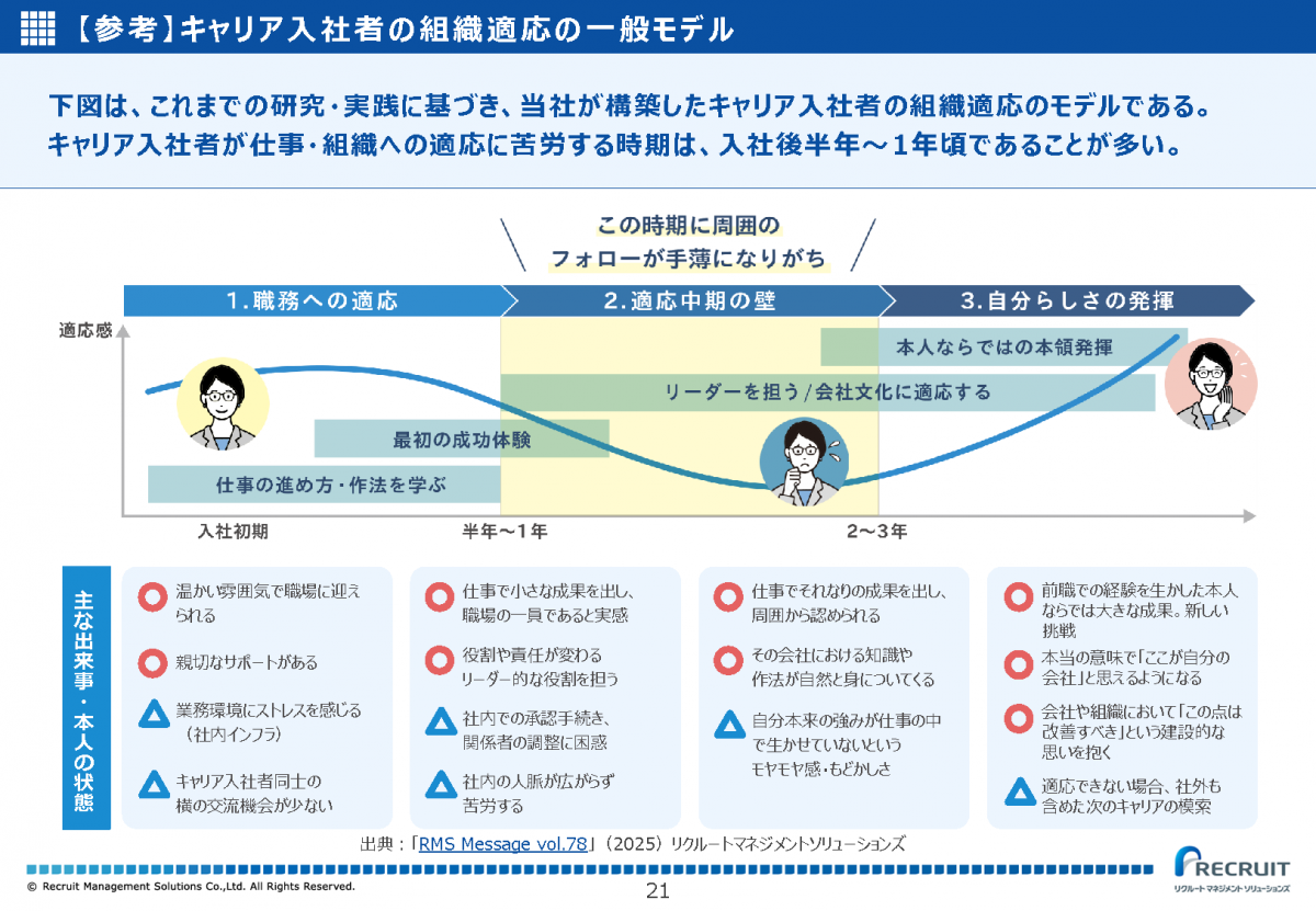 「入社から半年経つと、キャリア入社者は自ら社内の関係者を動かしていくことが求められます。そして、周囲が『もう組織になじんだだろう』と考え、フォローが手薄になりがちなタイミングでもあります。
