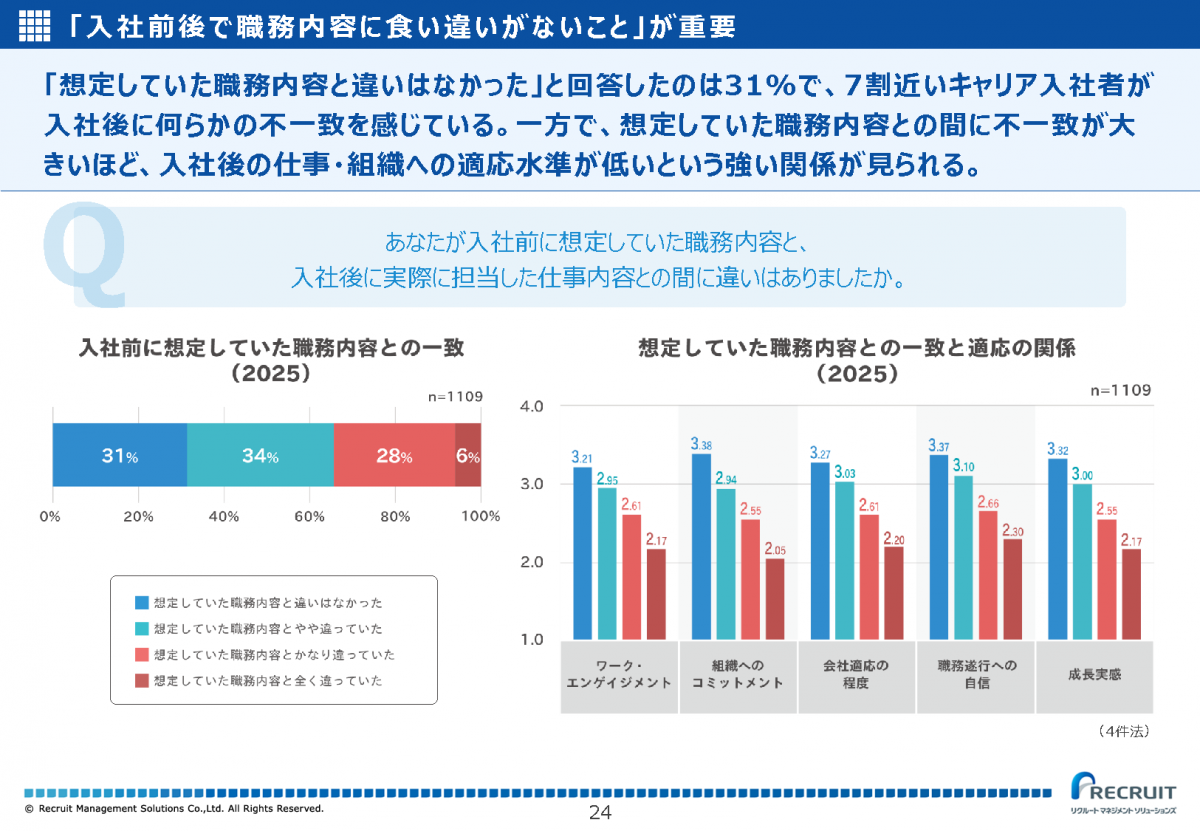 また、組織への適応には、入社前の情報開示の程度が影響することも分かった。入社前に想定していた職務内容と実際の担当業務に「違いはなかった」と回答した人はわずか31%にとどまり、約7割が何らかのギャップを感じているという。そして、このギャップが大きいほど組織適応の水準が悪化する傾向が強い。