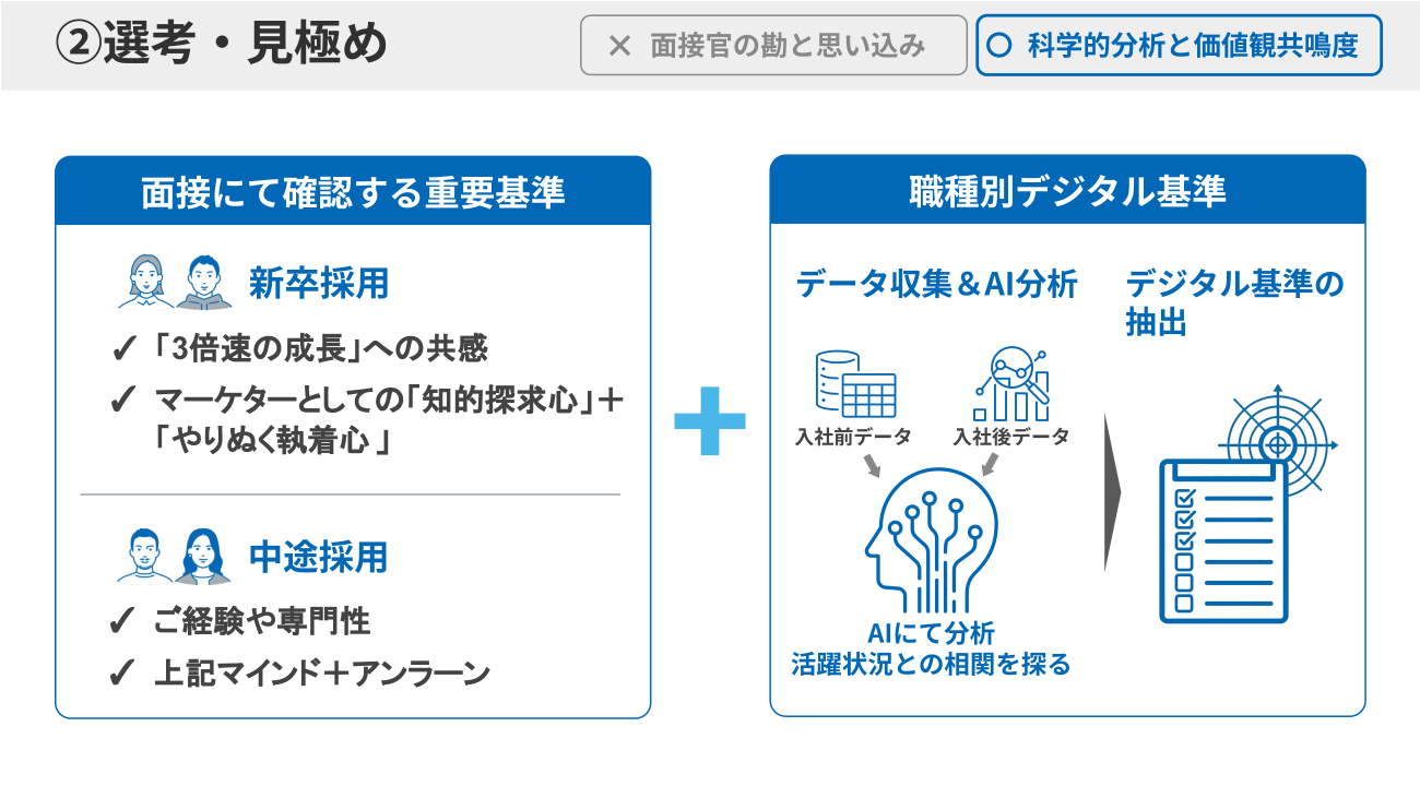 同社はデータ活用を事業の武器としており、採用においても例外ではない。入社前データと入社後データを用いて、AIが入社後の活躍状況との相関を分析。そうして抽出した職種別のデジタル基準と、面接で確認する重要基準を掛け合わせて見極めている。