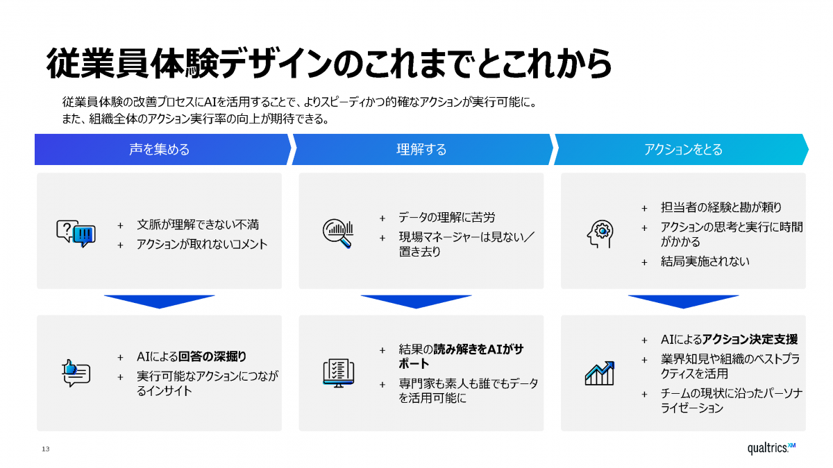 続いて、クアルトリクスの菊池晨氏からは、同社のサービスを活用しながら、いかにAIによる従業員体験の向上を果たしていくかという具体策が示された。