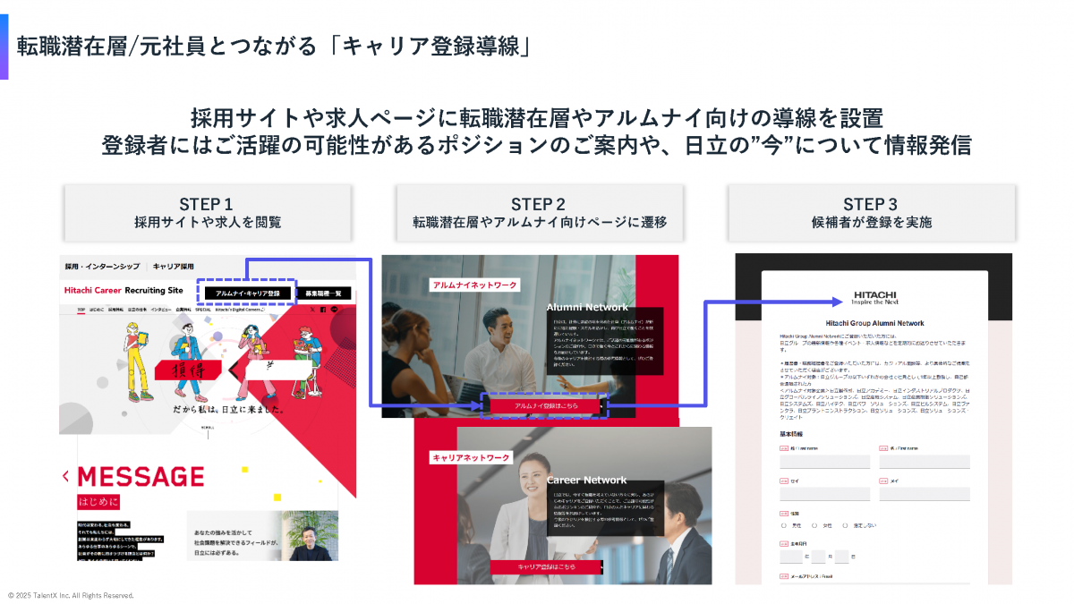 同社では、オウンドメディアを使って次世代の働き方や社員の事例、キャリアパスなどを紹介している。特徴的なのは、興味を持った人が気軽に登録できる「キャリア登録導線」を設けている点だ。転職顕在層だけでなく、現時点では転職を考えていない層や元社員も登録できる仕組みを整えている。