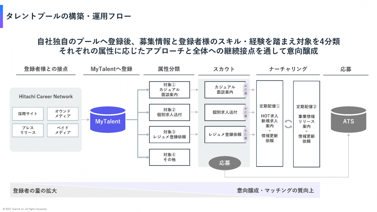 「タレントプールは、いま応募している人を管理するだけの仕組みではありません。採用の全体ファネルの中で接点を持った人と、継続的につながっていく考え方です」(近藤氏)