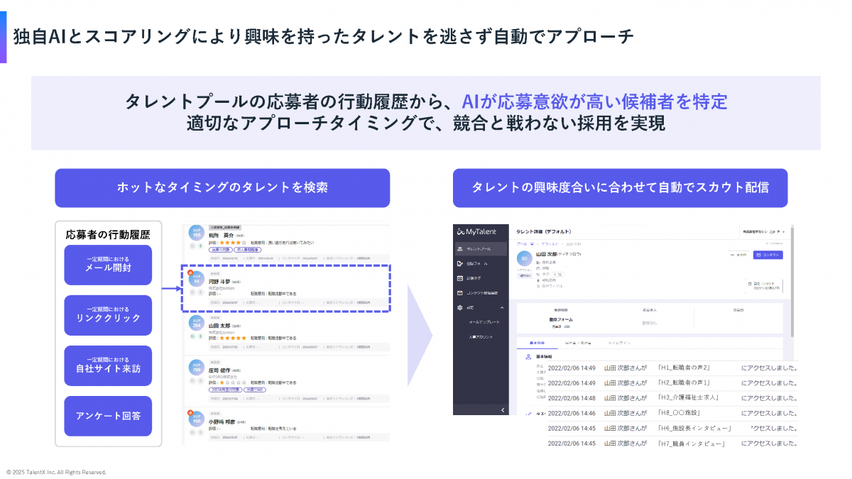 「これまで外部データベースに依存していた採用活動を、自社の資産を活用する形へと転換していく。MyTalentは、その基盤を支えるサービスです」(近藤氏)