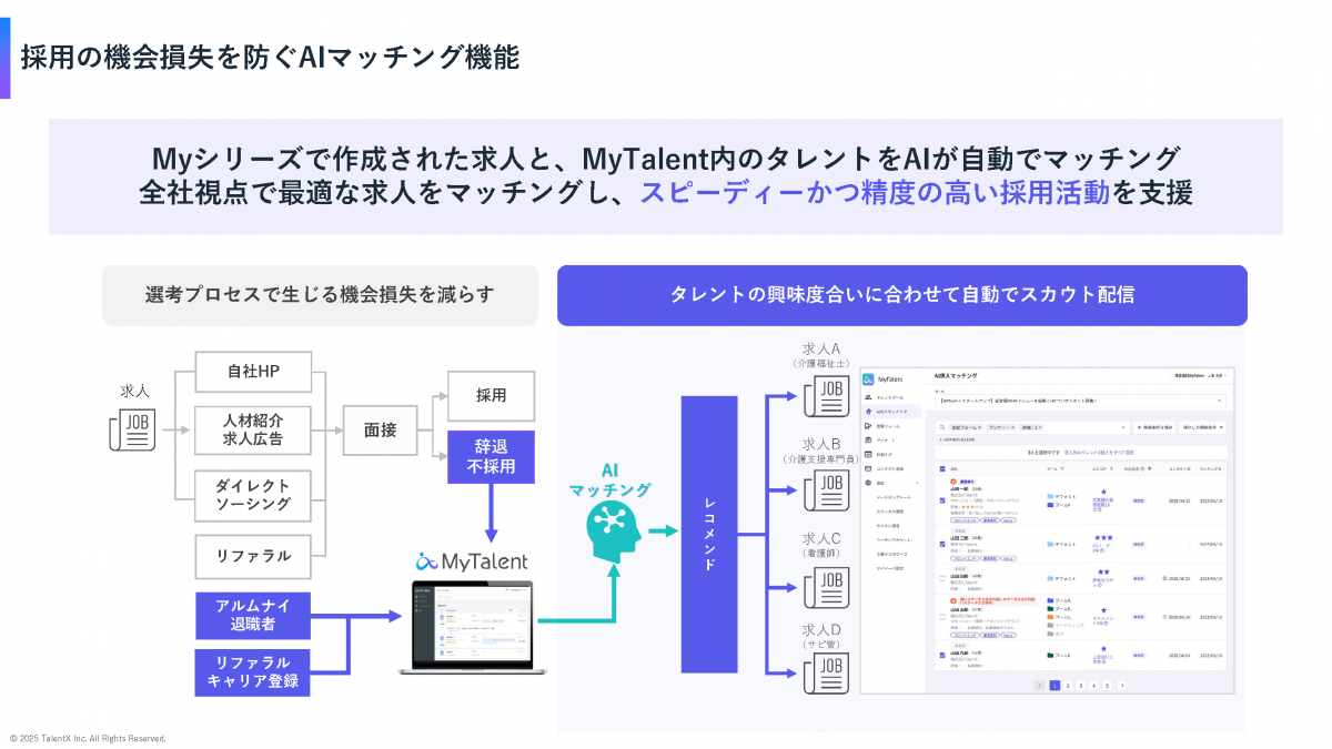 さらに、「AIマッチング機能」も実装。求人とタレントデータを照合し、適合候補者を自動抽出するだけでなく、マッチ理由の提示やワンクリックでのメッセージ配信にも対応している。