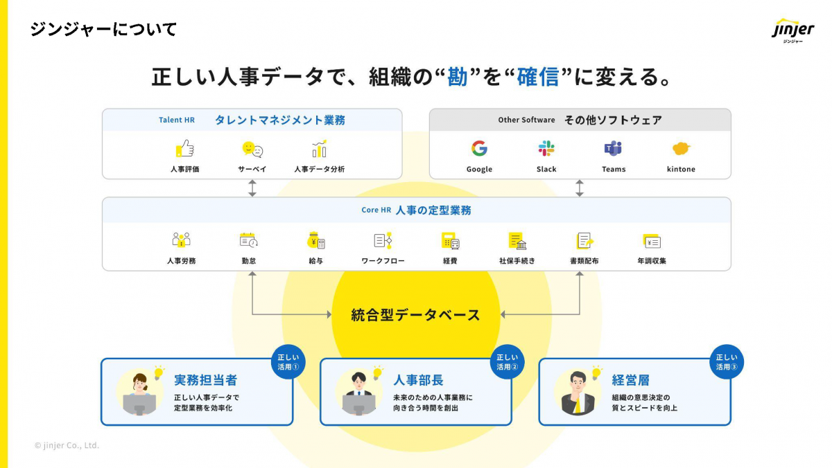 jinjerは、人事や労務、勤怠、給与、ワークフローなど多くの人事向けのツール群を提供してきた。そして、それを1つのデータベースであるジンジャーで提供し続けていることが最大の強みだ。