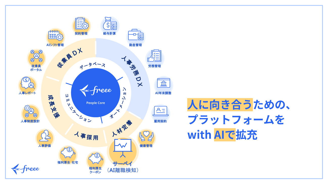 このように、freee人事労務は「時間を取り戻し、人に向き合う」ためにある。つまり、人事労務領域を越え、従業員の能力を最大化する“ピープルコア”の領域でも役立つAI機能を提供している。その1つが「サーベイ(AI離職検知)」だ。