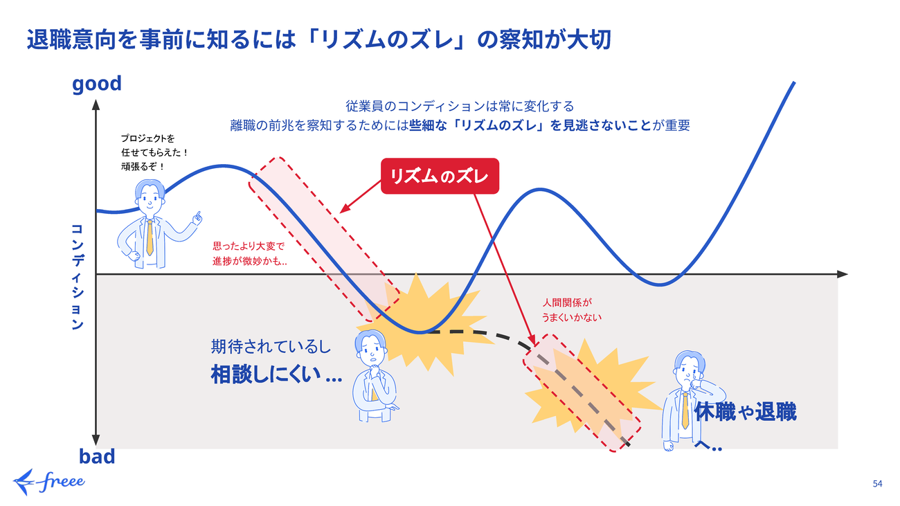 ではどうすればよいのか。「従業員のコンディションは常に変化するため、離職の前兆を察知するには、小さな“リズムのズレ”をAIで検知して見逃さないことが重要だ」と長澤氏は指摘する。
