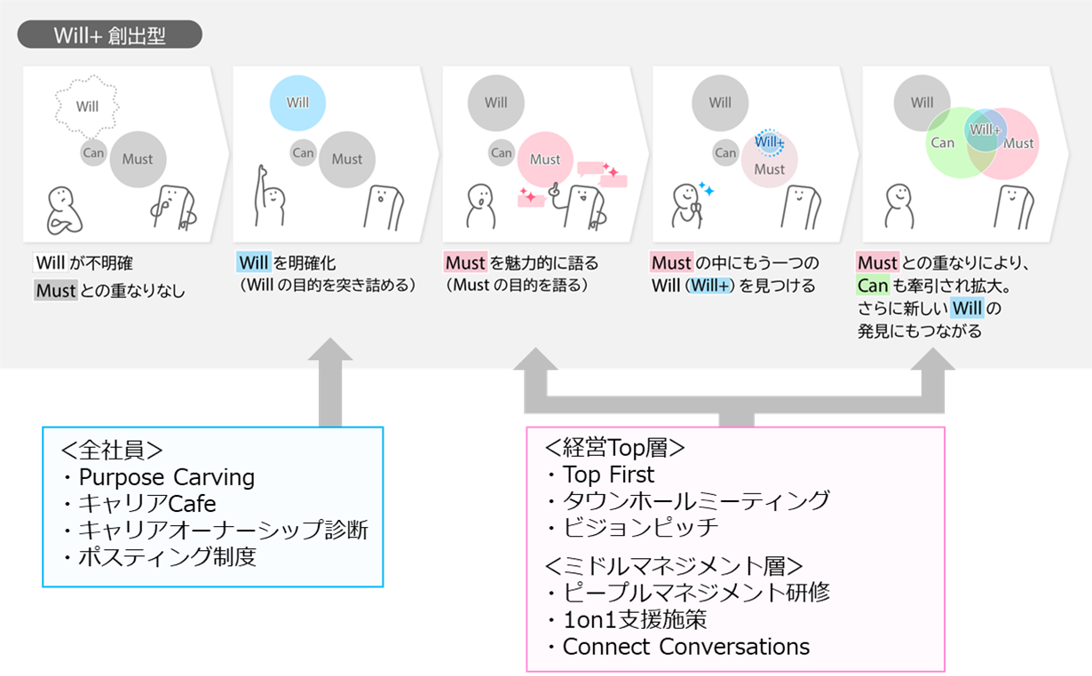 富士通では、次図の成長メカニズムにおける「Mustを魅力的に語る」場面において、経営層やマネジメント層が事業戦略や環境変化を踏まえた将来の人材ポートフォリオに沿ってMustの将来像を考え・伝えています。それを受けて社員1人ひとりがWill+を自らデザインすることでキャリアオーナーシップを醸成しています。