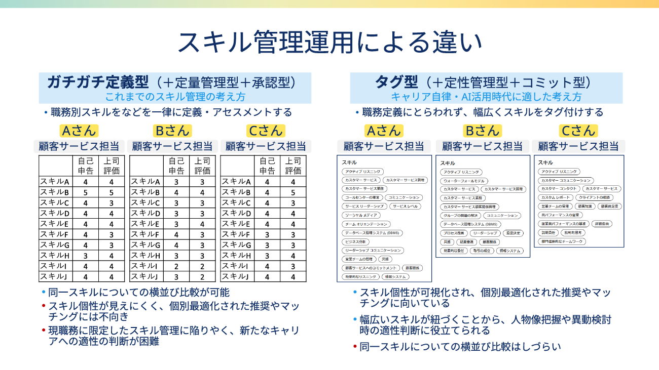 ポイント3でのスキル管理のコンセプトは、テクノロジーの活用方法にも影響を与えます。ここでは「ガチガチ定義型(+定量管理型+承認型)」と「タグ型(+定性管理型+コミット型)」という2つの対照的なコンセプトを例に、その違いを説明します。